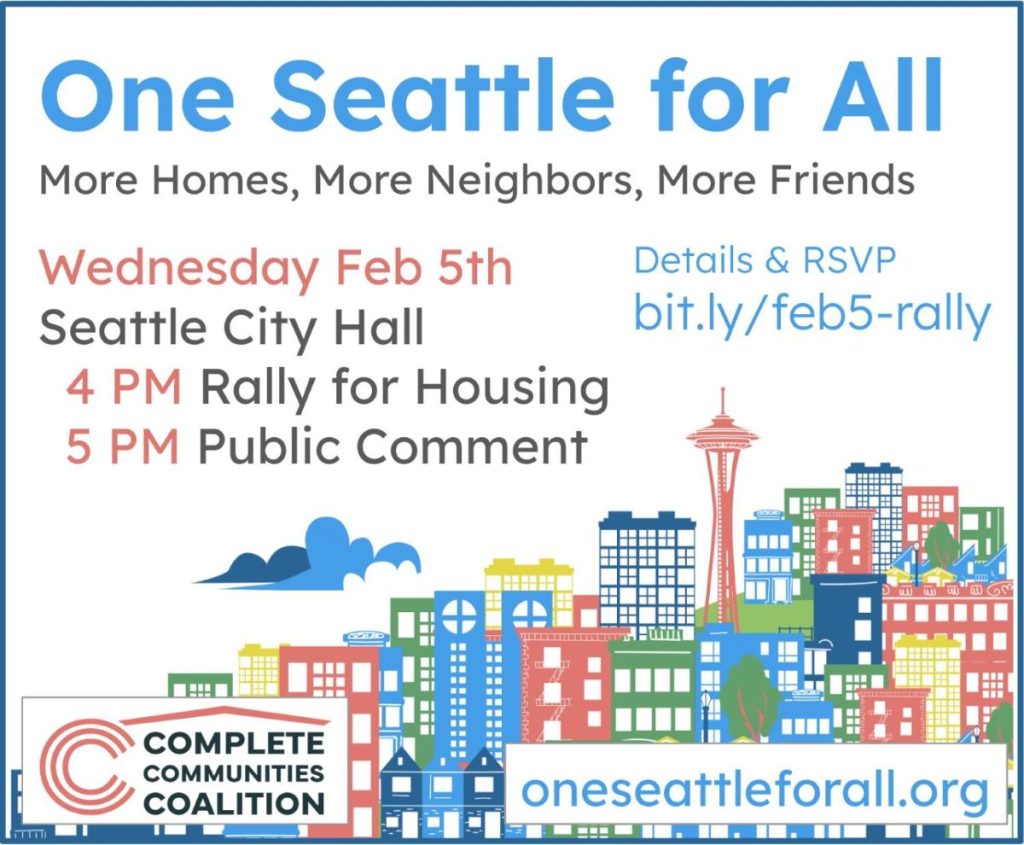 With the mayor’s proposal in hand, the ball is now in the city council’s court. Council has scheduled a public hearing scheduled for 5pm Wednesday, February 5 at Seattle City Hall. The Complete Communities Coalition is planning a rally at 4pm, shortly before the sign-up for public comment opens. Pro-housing advocates have also created a One Seattle For All petition tool to make contacting councilmembers easy.