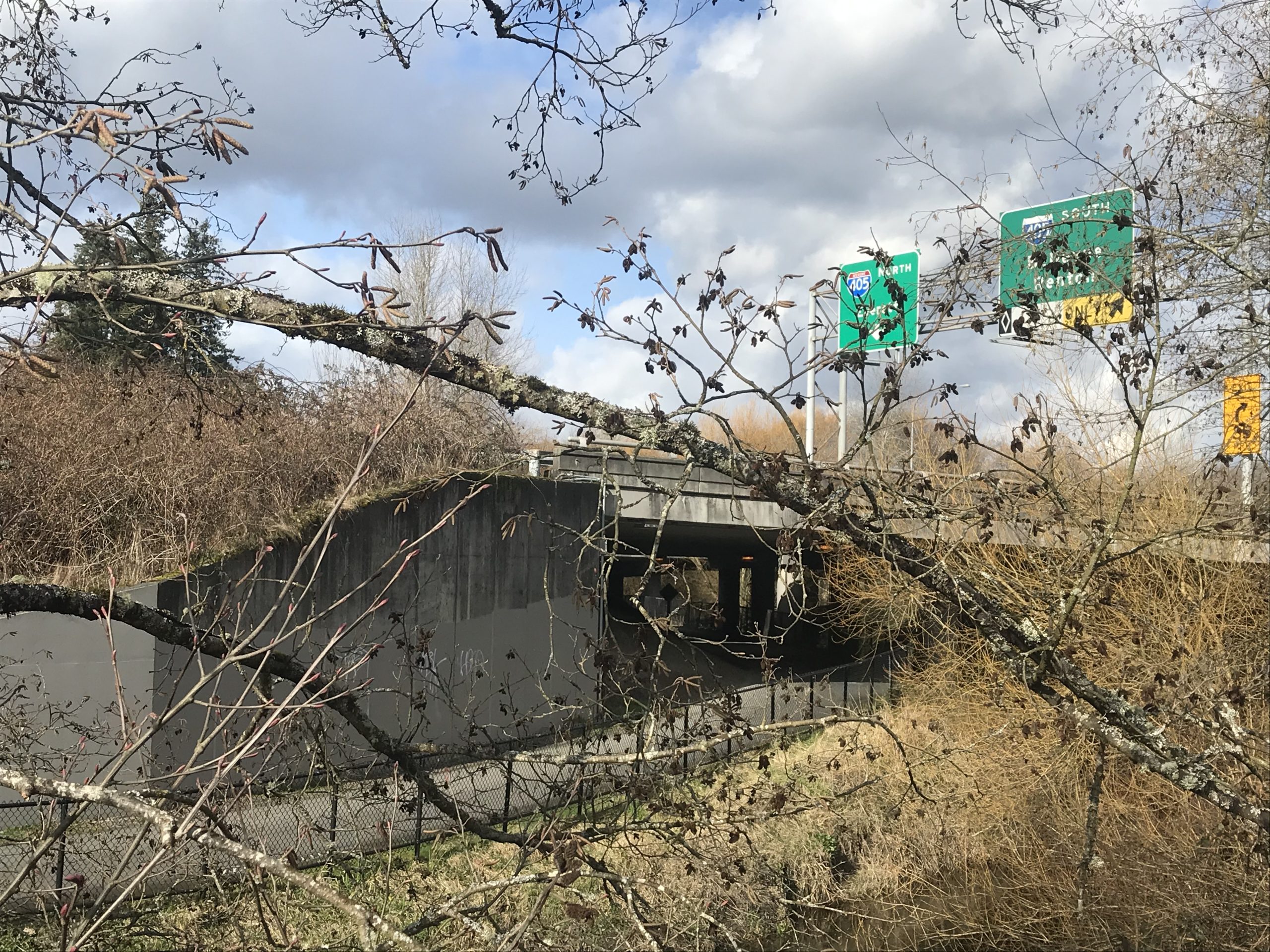 A view toward the North Creek Trail from the Sammamish Trail. SR-522 is the highway in the background.