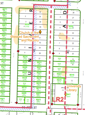 The Blessed Sacrament property is currently split zoned. A bit more than half of the site is zoned as Lowrise 1 (LR1), a medium density residential zoning type, while the other half is zoned as SF5000, a low density residential zoning type. Prior to the comprehensive plan land use map amendments, the property was also split between Multi-Family Residential with an Urban Center designation and Single Family Residential.