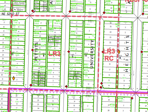 And the third of these is the east block of University Way NE, stretching from NE Ravenna Blvd to NE 56th St. That block consists of a mix of commercial and multi-family residential uses, yet the properties are zoned as LR3, a medium density residential zone. The properties were included in the Urban Center overlay so as to allow a future rezone for mixed-use, mid-rise development.