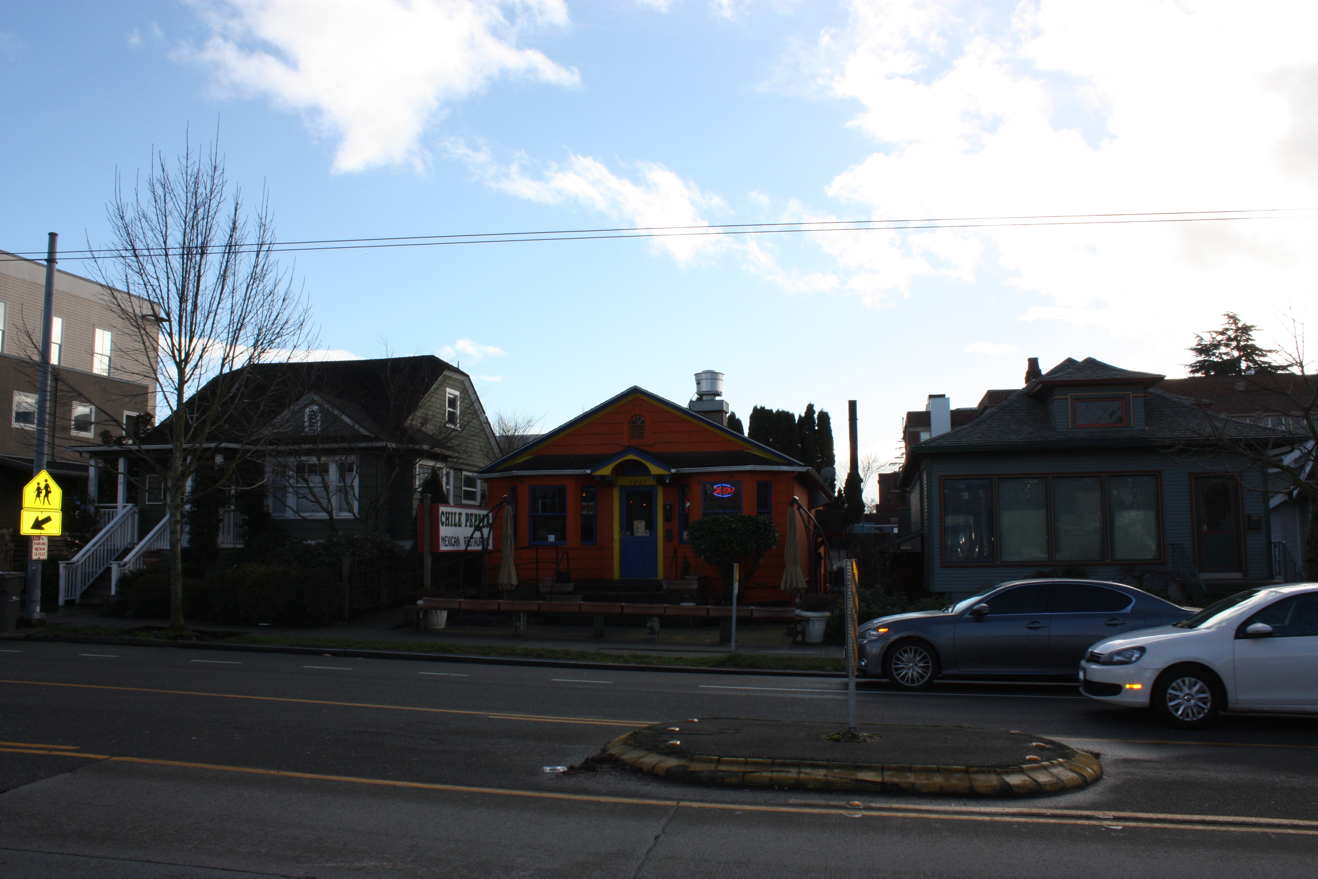 More single-family homes between Interlake and Woodlawn Avenue. The orange one in the middle houses the Mexican restaurant Chili Pepper.