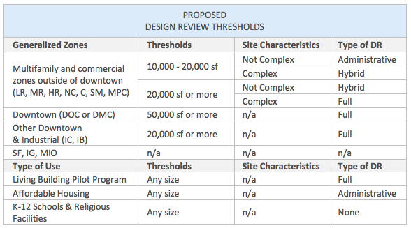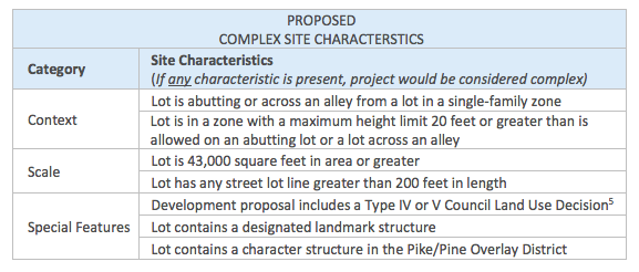 Proposed complex site characteristics for the new design review thresholds. (City of Seattle)