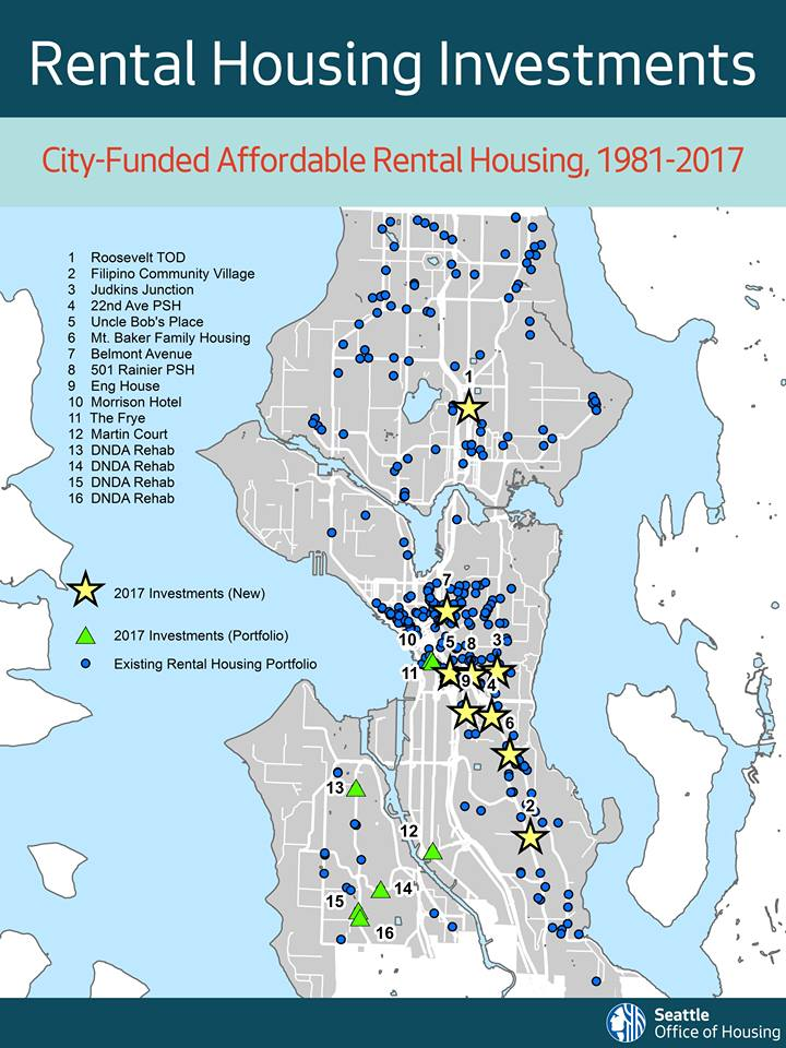 Housing advocates scored a cathartic victory to start 2018 when they turned out in droves and greatly outnumbered opponents at a public meeting on Seattle Office of Housing’s plan to develop 238 affordable homes at Fort Lawton. The “Yes In My Backyard” movement picked up steam in 2017, and the Fort Lawton meeting was an exclamation point. (Of course, Fort Lawton isn’t a done deal yet.) Can housing advocates build on that success to prevent other projects from being blocked or delayed by noisy opposition? Will policymakers give advocates more opportunities by upzoning more sacrosanct million-dollar home territory? Will developers see a changing landscape and propose projects they would have thought too risky before? It’d be great to see affordable housing projects go in other wealthy enclaves that have mostly blocked them one way or another–neighborhoods like Montlake, Madison Park, Laurelhurst, Upper Queen Anne, Seward Park, and anything west of Fauntleroy Way in West Seattle, as you can see in the map below.