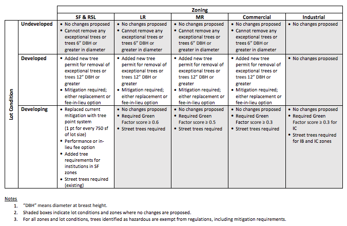 White cells indicate where policy changes are under consideration. (City of Seattle)