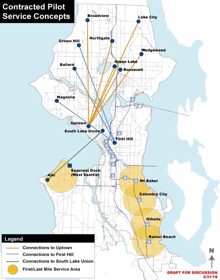 Conceptual routes and service areas for the contracted pilot transit service program. (City of Seattle)