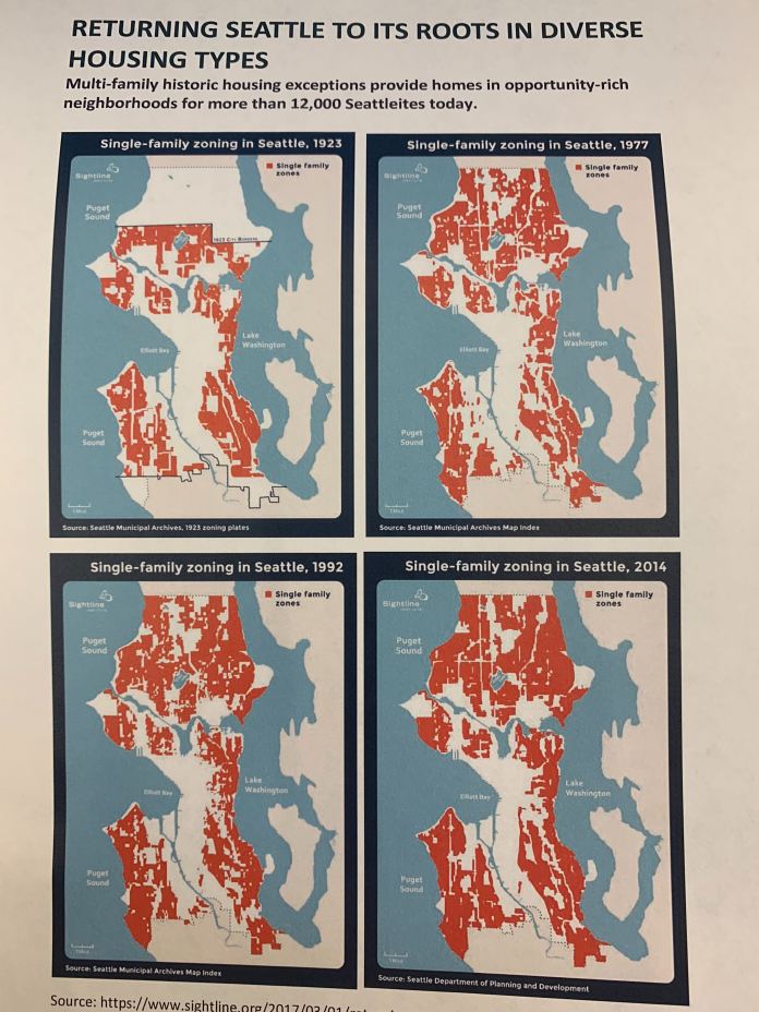 Councilmember Teresa Mosqueda, who is also Latina, referred to Seattle’s history of redlining and racially restricted covenants in her remarks as well. Mosequda passed out a handout to the crowd showing how the amount of single-family zoned land have remained unchanged over time in Seattle.