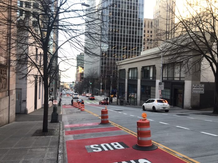 A new transit pathway in Downtown Seattle opens on Saturday. Local officials say that a two-way bus connection on Columbia Street will benefit more than 26,000 daily bus riders, providing easier and more reliable service between the city center and areas to the south. West Seattle, White Center, and Burien riders have been hit hard by the Seattle Squeeze, particularly since the new SR-99 tunnel opened and deconstruction work on the former viaduct forced reroutes to surface streets through SoDo and Pioneer Square. King County Metro all but issued an apology to riders at the end of summer over mounting delays, some approaching a full hour, due to interim routings on 1st Avenue without dedicated bus lanes.