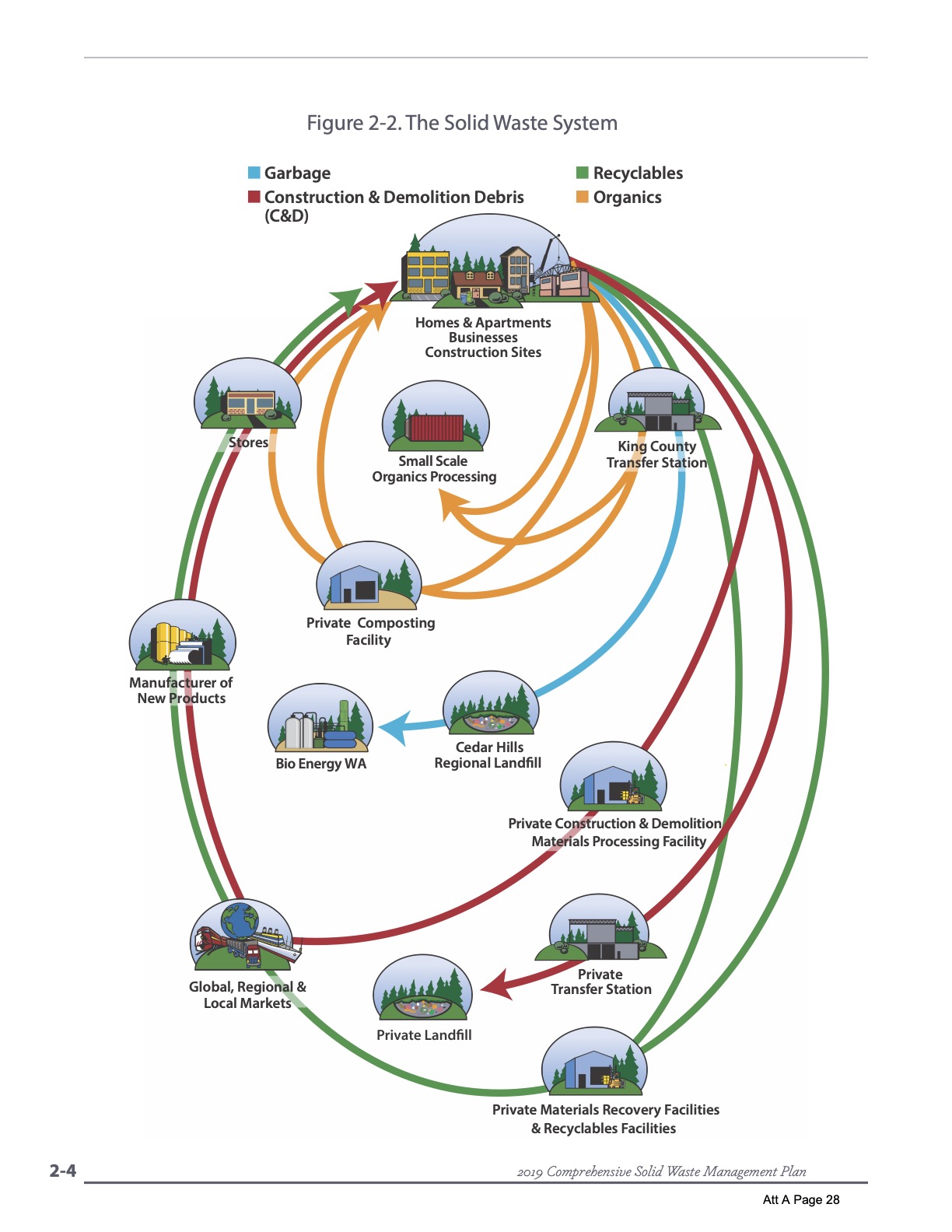 A diagram of the three solid waste streams. Recycling goes to private recycling facilities by truck. Compost goes to private compost facilities by truck. Garbage goes to the landfill by truck, then produces energy through methane capture.