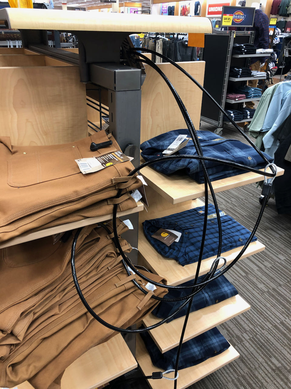 Work pants chained to the shelf with thick steel cables.