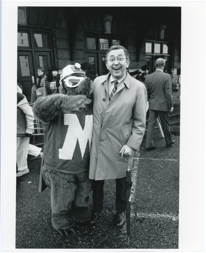 A mole mascot with sunglasses, a backward baseball cap, and a big M on its chest poses with a dapper-looking man on the street.
