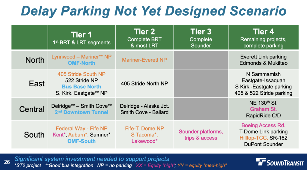 The “delay parking” scenario uses a strategy of smaller incremental light rail projects and separating parking elements of projects into standalone projects. This means that smaller light rail extension segments would be delivered as individual projects — allowing for phasing like Delridge-Alaska Junction, Delgride-Smith Cove, and Smith Cove-Ballard (three projects) versus full West Seattle and Ballard extensions (two projects) — and parking projects could be placed at the back of the line.