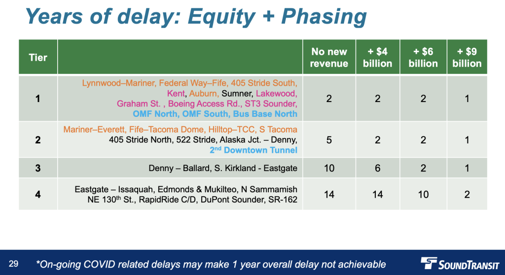 - The “equity and phasing” scenario would similarly keep most light rail, Sounder, and Stride projects to small delays, but Denny-Ballard, South Kirkland-Eastgate, and Eastgate-Issaquah light rail extensions would face heavy delays.