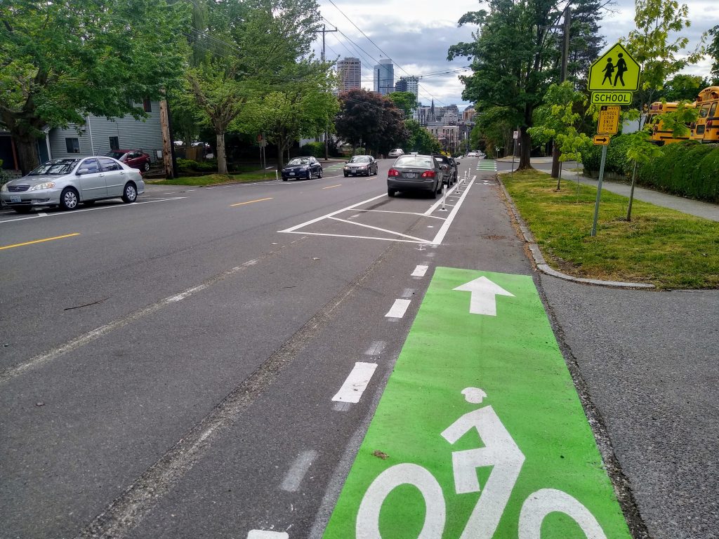 - Extending the lane that was added to 4th Avenue in Downtown both north to Vine Street and south to Yesler Way (via an odd detour) and converting the entire facility to two-way operation.