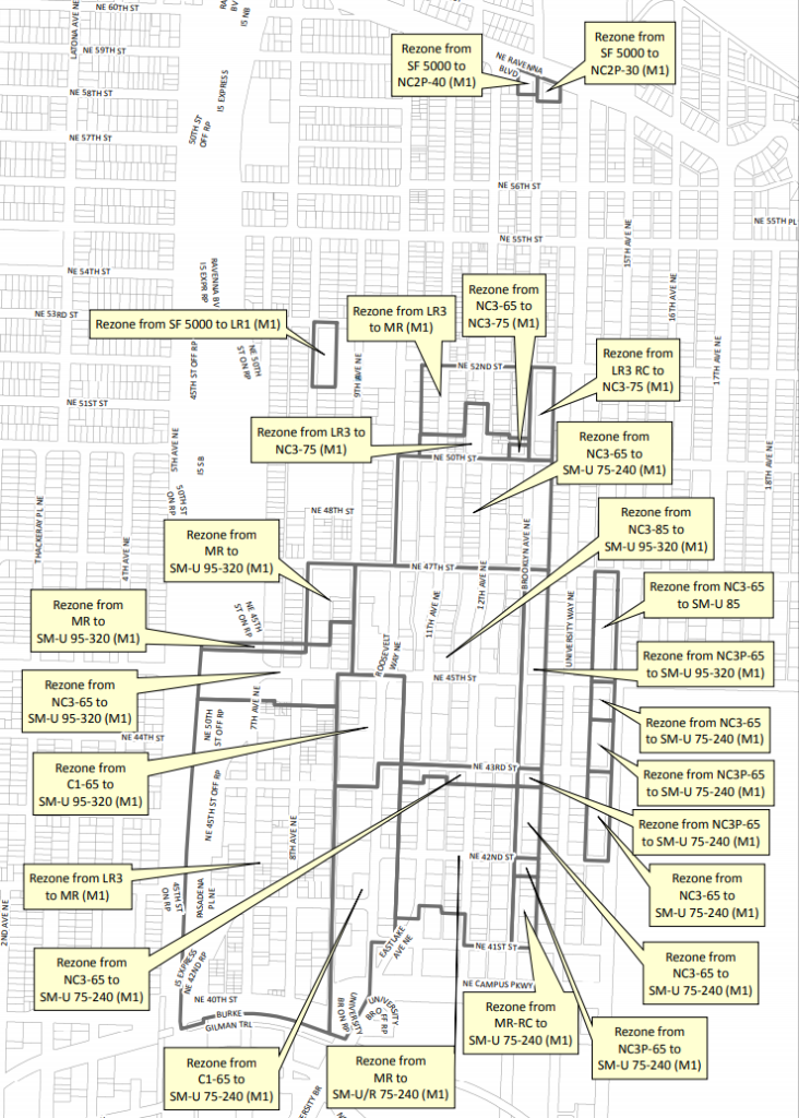 The development is only possible because of the 2017 Mandatory Housing Affordability (MHA) rezoning process that reintroduced the ability to construct towers in the U District. This updated zoning allows highrises between NE 50th St and the Burke-Gilman Trail, within a narrow column of blocks that also extends to I-5 with NE 45th St. The following 2017 update extended highrise zoning into University of Washington’s West Campus, all the way down to Portage Bay.