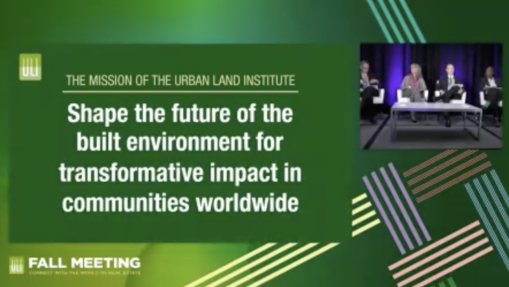 Panel of four speakers inset on green presentation slide saying “Urban Land Institute mission: Shape the future of the built environment for transformative impact on communities worldwide.”