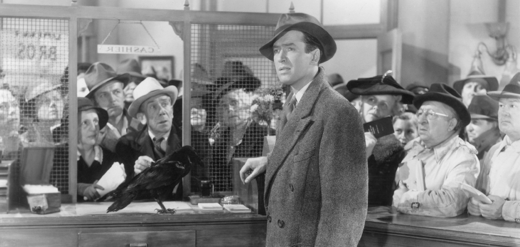 Tall and slim Jimmy Stewart in a fedora and coat behind the counter of a bank with a crowd of people on the other side and a crow sitting on the counter.