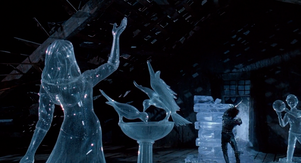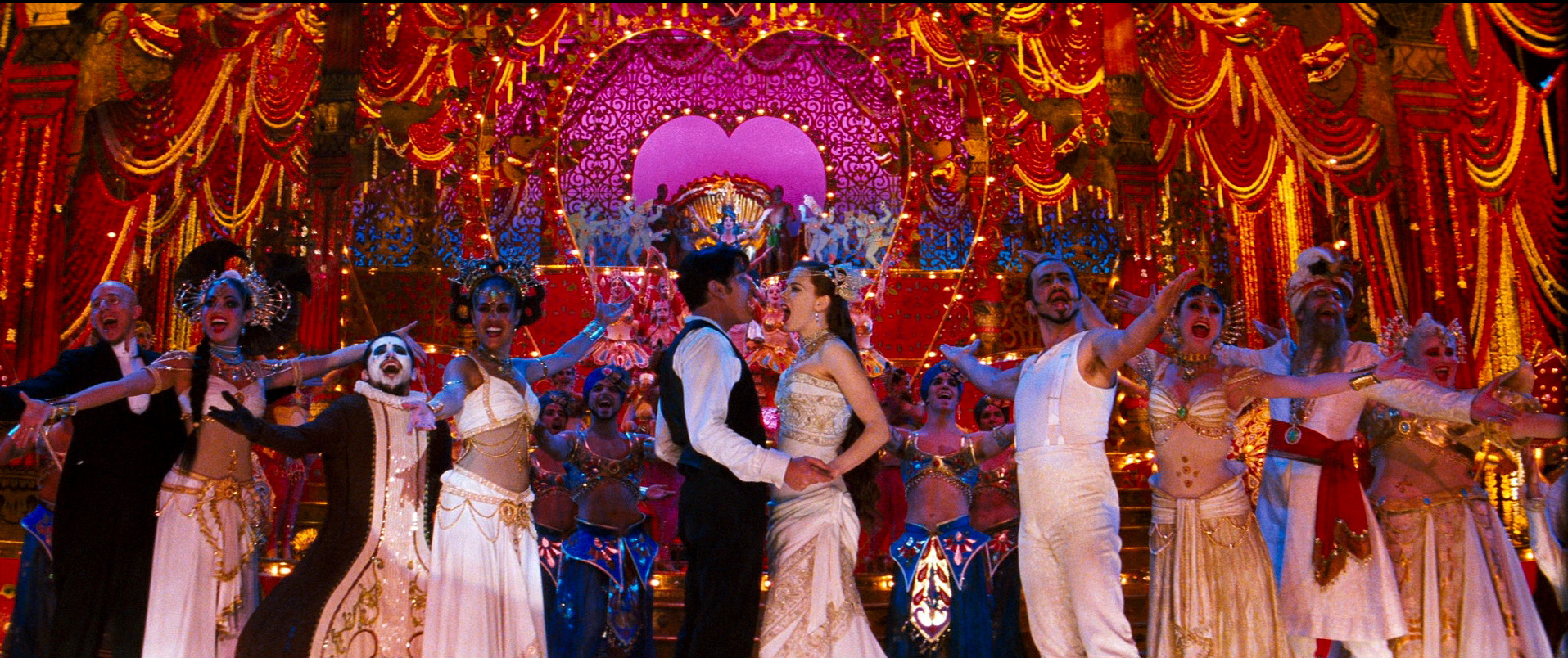 Setpiece scene from musical with row of costumed singers in white before an opulent and layered red set featuring having curtains and giant heart window. Main singers – Ewan McGregor in a black vest and Nicole Kidman in white gown – singing at one another in the center.