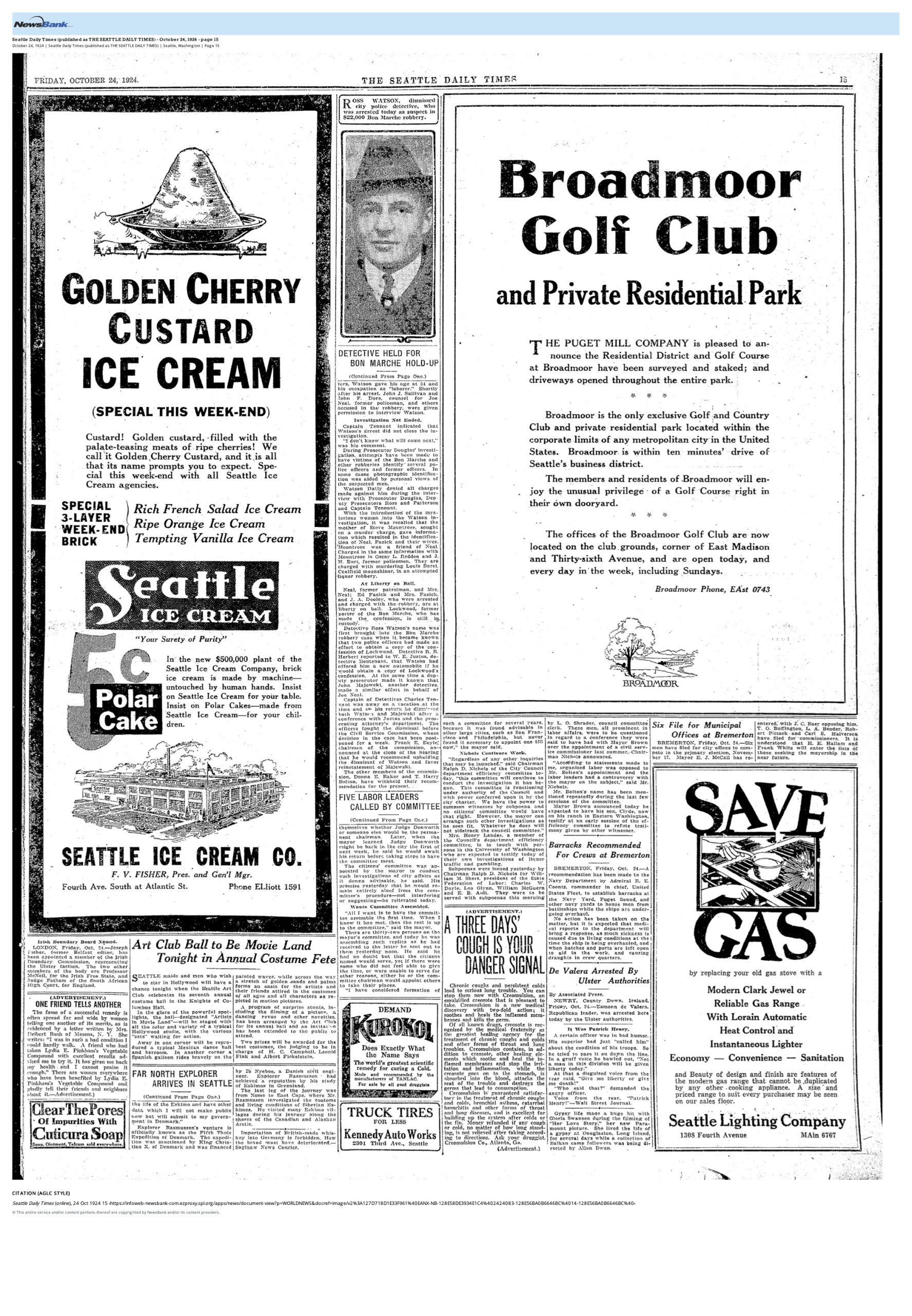 Full page newspaper image with several headlines and ads. Top right ad for Broadmoor Golf Club and Private Residential Park. Images and text for other articles.