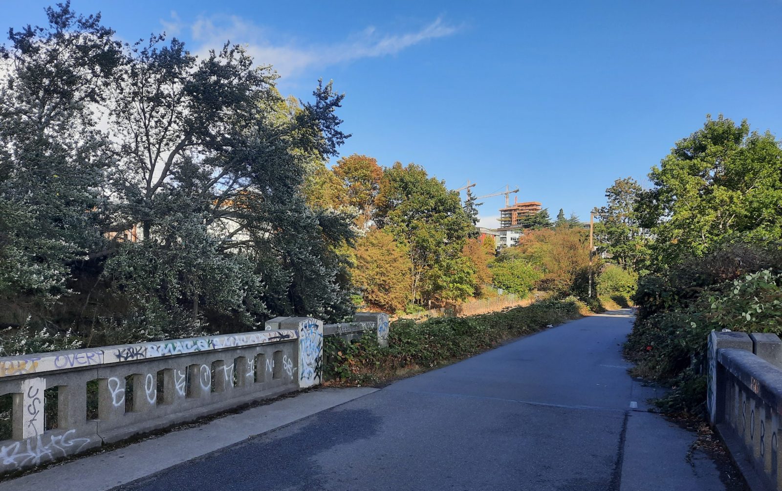Burke Gilman trail with view of new U District skyline