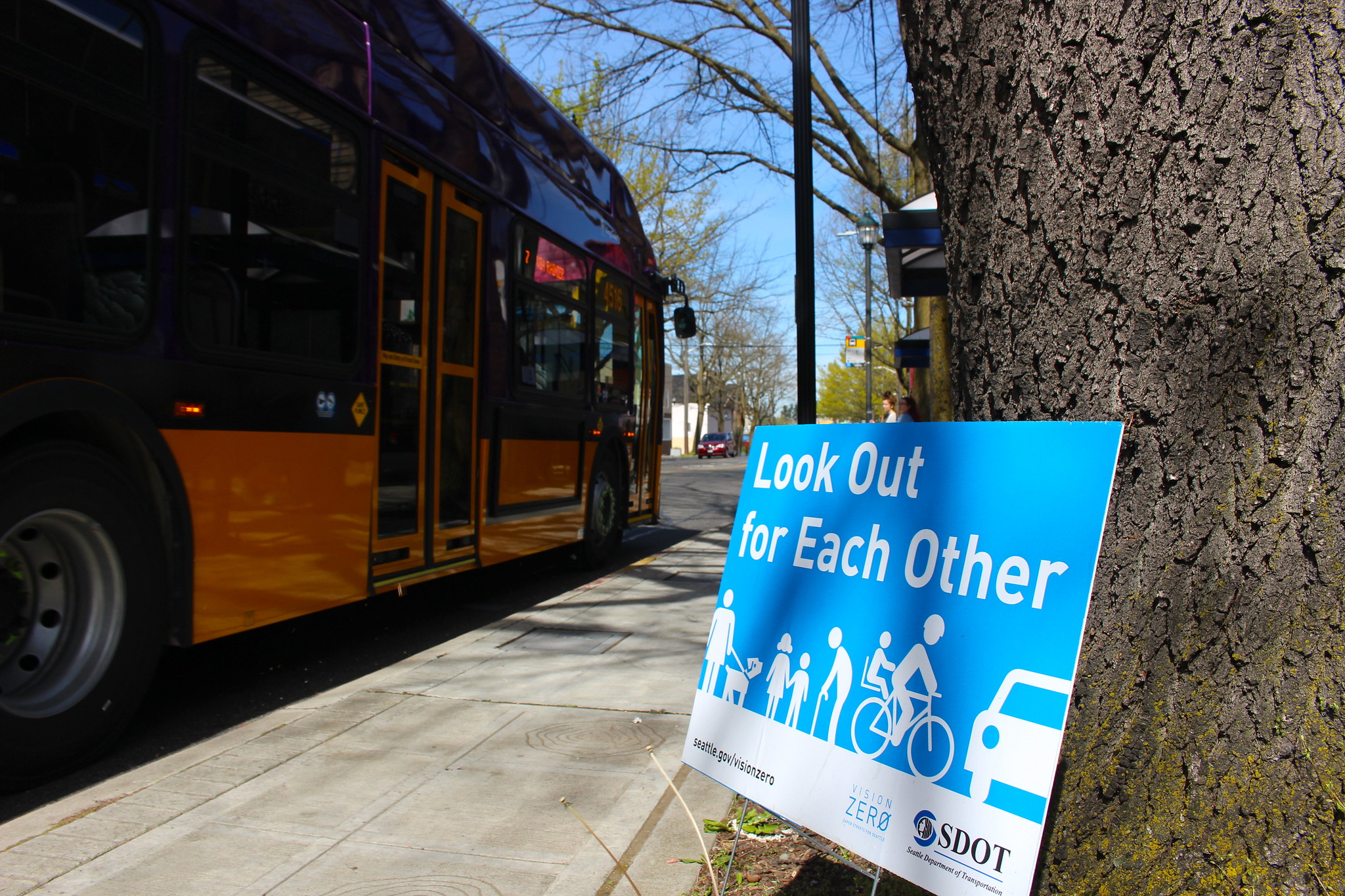 A bus rolls by a sign reading Look Out for One Another with an SDOT logo