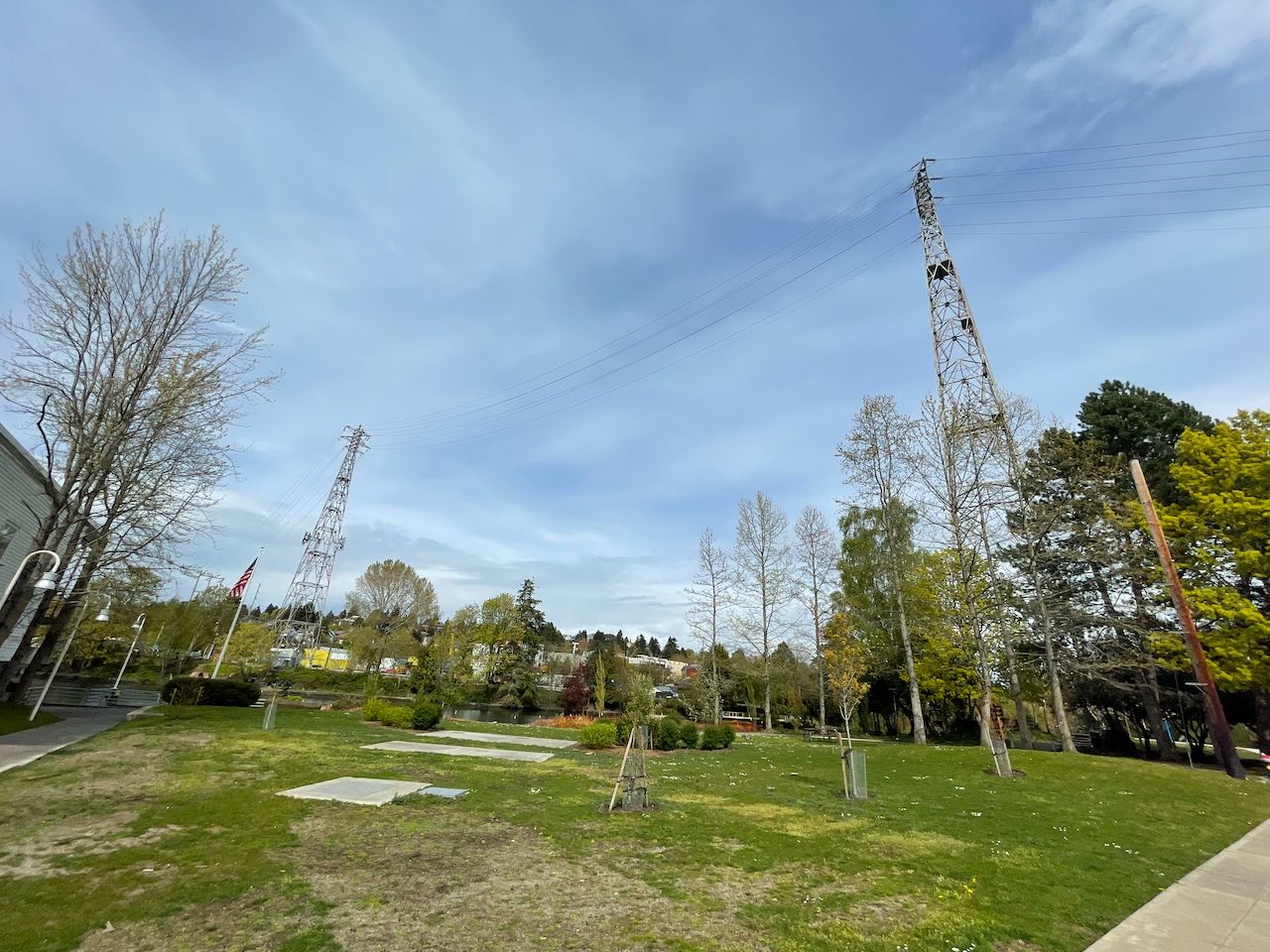 Overhead power lines on tall steel towers over grassy park and a thin canal.