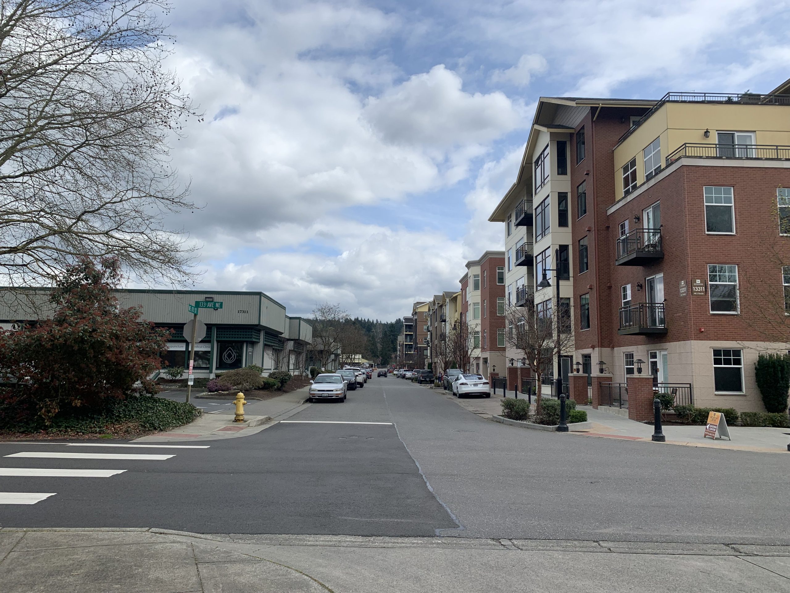 A street, with on-street parking, separating a new dense part of downtown Woodinville with a more car oriented part of the city