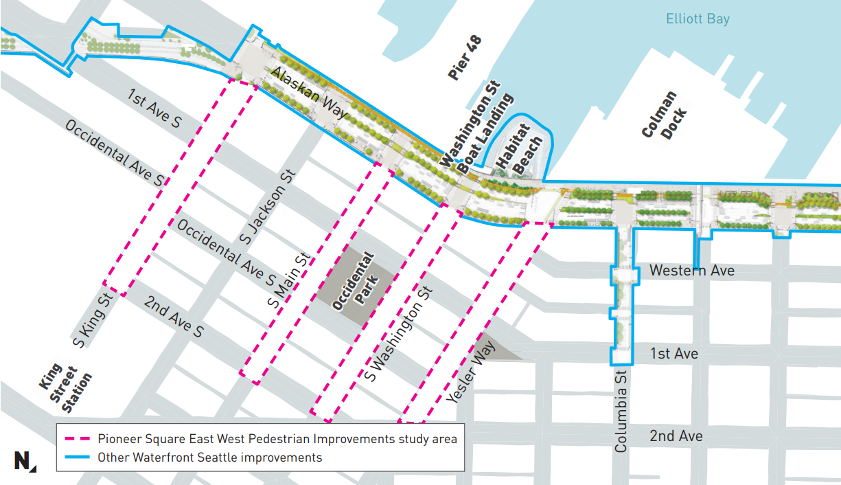 View looking up Yesler with the Smith Tower and Pioneer Square buildings