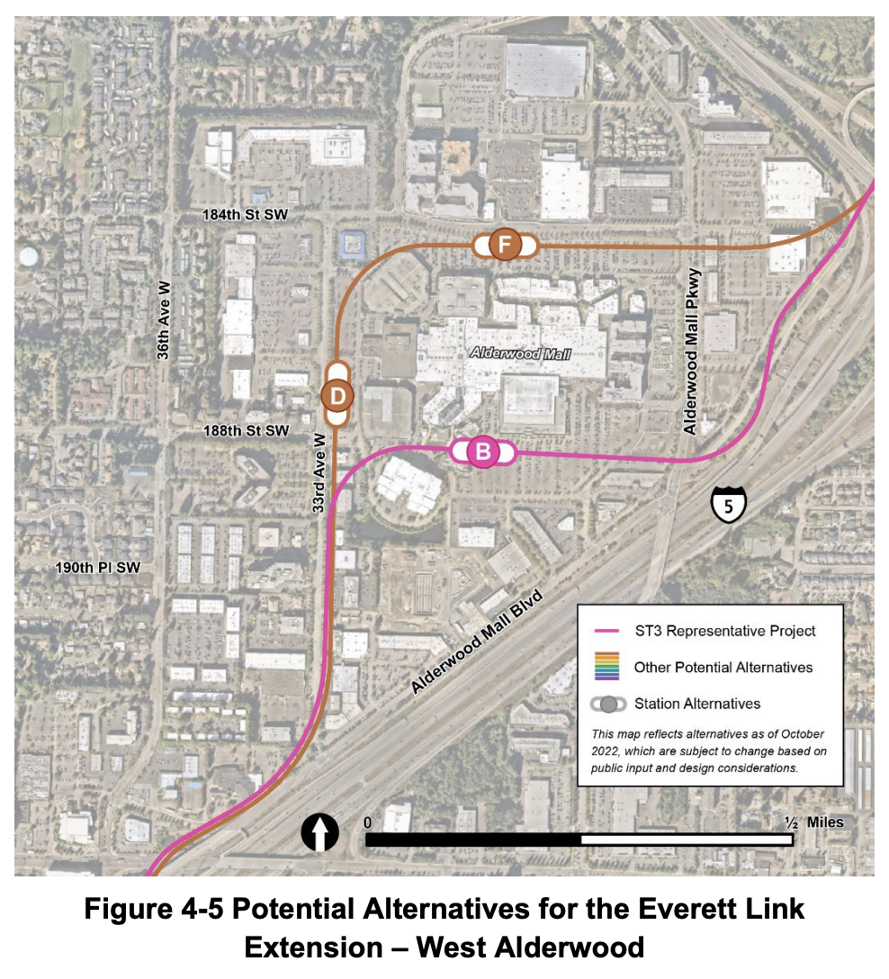 At West Alderwood, potential routing and station locations have been trimmed down to three alternatives.