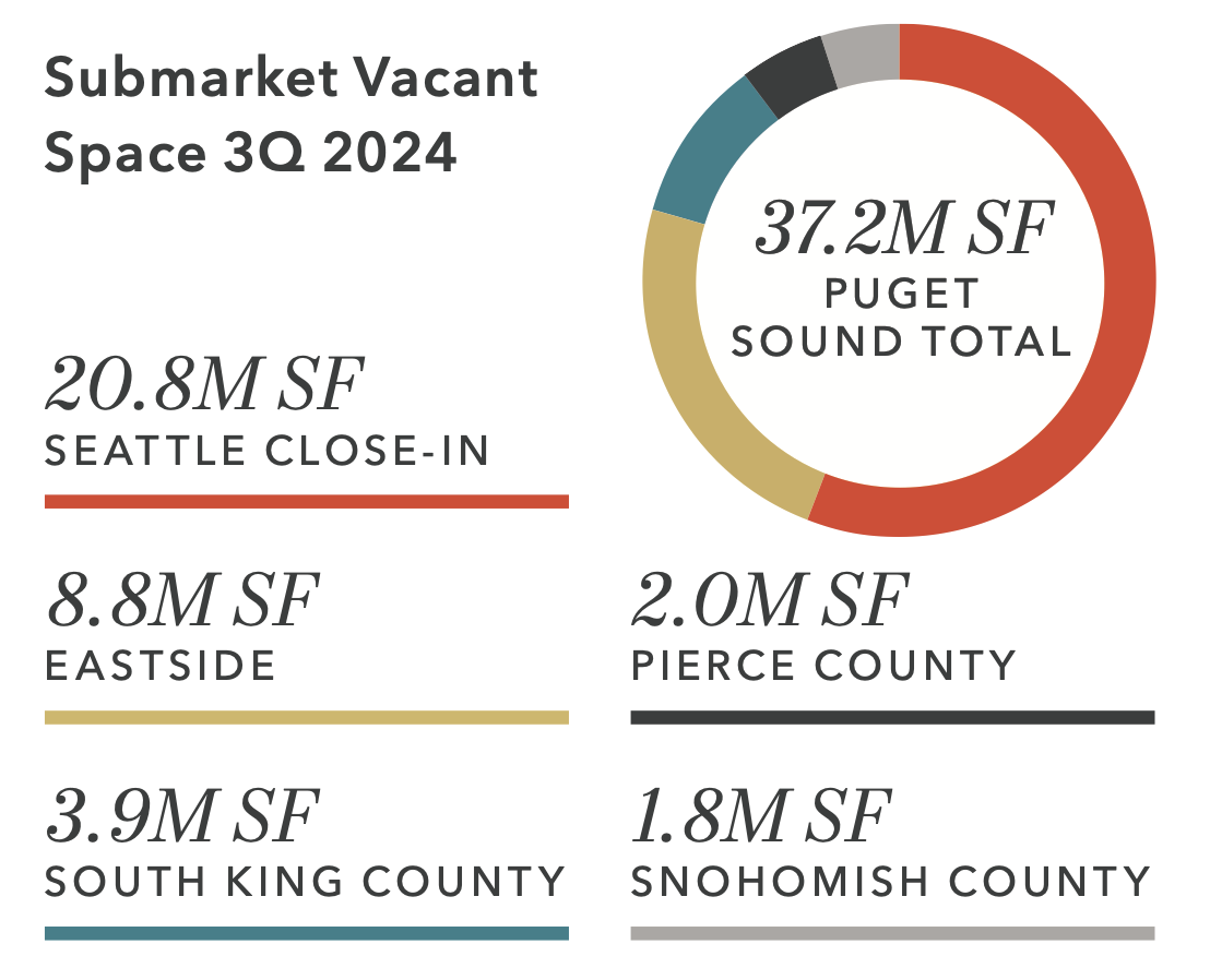 Research by commercial real estate firm Kidder Mathews found that office vacancy continued to rise in the third quarter of 2024, reaching a vacancy rate of 27.6% in Seattle’s Central Business District. In the city of Seattle as a whole, office vacancy rates were reported at 19.42%, the highest percentage in the region. This percentage translates into roughly 20.8 million square feet of vacant office space. When analyzing the Puget Sound region as a whole, Kidder Mathews estimates that about 37.2 million square feet remains vacant.