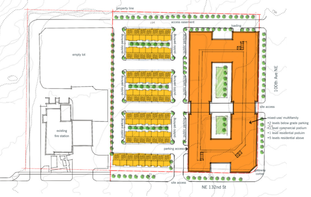 Despite the Kirkland planning commission giving the green light on a 75-foot height limit for both sites earlier this year, a proposal advanced at the end of October looked to scuttle the past two years of deliberations. On the eve of the council elections, Kirkland city staff put forward the idea of switching the parcels over to a standard “base” mixed-use neighborhood center zoning, capped at 60 feet. To rise higher, the developers would have to go through the process of receiving a development agreement specific to their project, something that would have likely added a few more years of process and erased much of the work that had occurred up to that point.