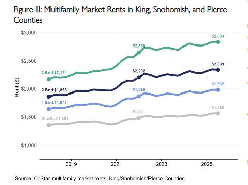 The ACH report notes that in 2023, the median rent for a market-rate studio apartment in the Seattle metropolitan area was $1,646, below the maximum allowable rent for an 80% AMI rent-restricted studio. Moreover, the median market-rate rent for studio apartments in King, Snohomish and Pierce counties was $1,565 in 2025, which is competitive with the maximum rent for 50% AMI rent-restricted studios ($1,375).