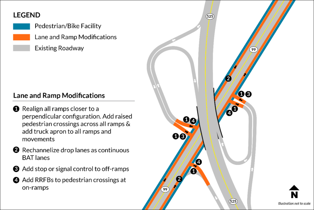 Major changes are also being proposed for the interchange between SR 99 and SR 525, which connects I-5 with Paine Field. Ramps would be realigned to create perpendicular angles and slow speeds, and all ramps would be either signalized or have stop control. Pedestrian crossings would be raised and include rectangular rapid flashing beacons (RRFBs) to increase visibility.