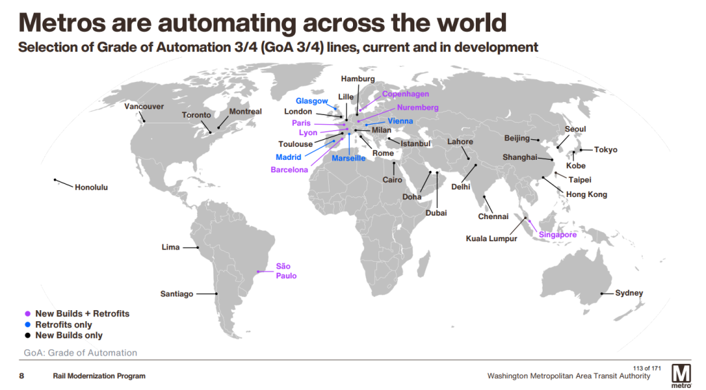 Automation belongs in this discussion as well. Train operators and the administrative staff that support them account for ~12% of LRT operating expenses (~$4.5 billion).3 Additionally, by decreasing the cost of providing service, it is feasible to provide more frequent service across all hours. What’s more, eliminating the remaining driver cabs (and the improvements above) increases rail car capacity by 10% to 25%.