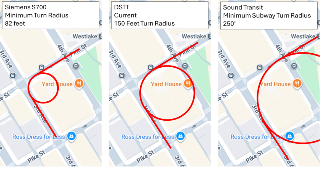 This is to say nothing about the minimum turn radii Sound Transit applies to its track design, which makes cut-and-cover construction impractical without massive right-of-way acquisition cost (example below). Vancouver reduced cost by 16% on the Canada Line changing from deep bore tunneling to cut and cover.