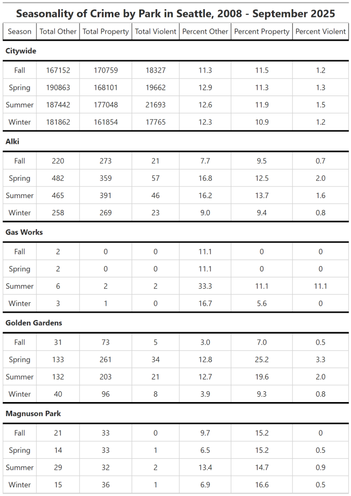 A more detailed breakdown below shows the seasonality of crime at the above listed parks, compared with the city. Percentage rates are grouped relative to crime per park, i.e. a value of 2.0 in the column “Percent Violent Crime” for Golden Gardens in Summer signals that 2% of all crime to have occurred in Golden Gardens Park is violent crime in the summer months.