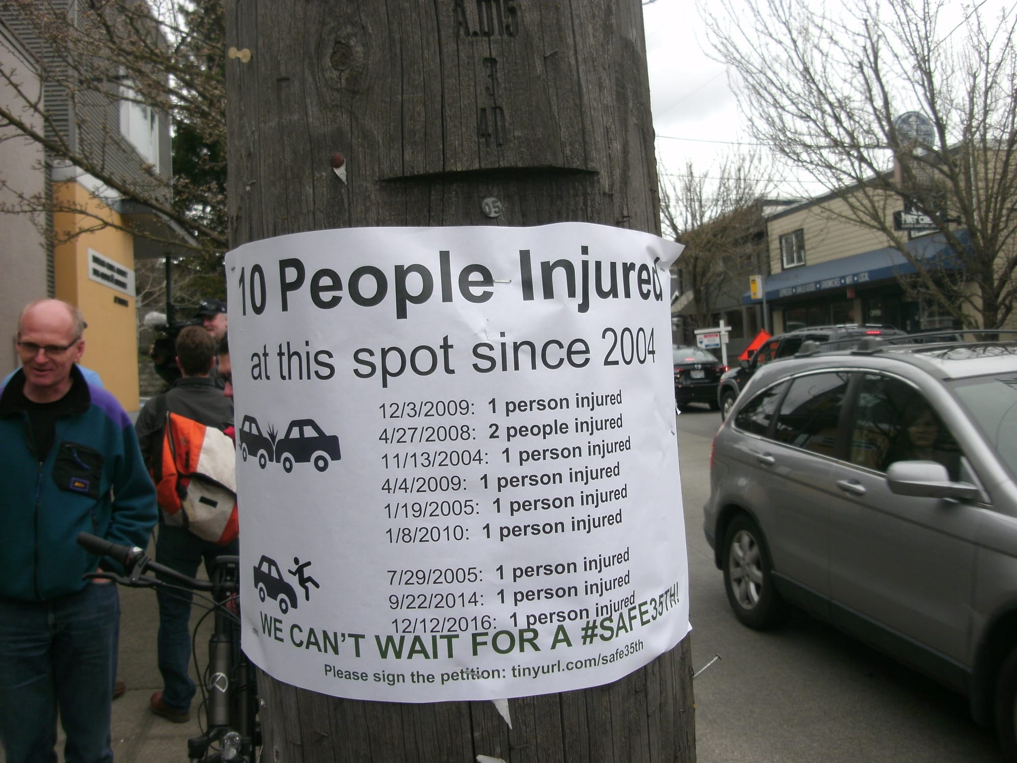 As the group headed south into the heart of Wedgwood, one of the more outspoken advocates for changes on 35th, Liam Bradshaw, posted signs at the intersections, informing passersby of how many collisions, usually between people in vehicles but frequently involving people on foot or on bike, happened at that intersection in the last decade or so. At NE 65th Street and 35th Ave NE there were 21 collisions causing injuries since 2004, including 4 pedestrians hit by cars. All the way from one end of 35th to the other, there have been 198 people injured since 2004.
