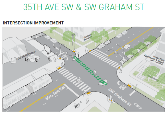 SDOT planned the 35th Ave SW segment from Roxbury to Willow as phase one of the project from the beginning, with initial plans for phase two proposed in 2016 that included rechannelizing some of 35th north of SW Morgan St to match the southern segment already completed. That stretch includes SW Graham St, where there have been two fatal collisions in recent years, one involving someone on foot and one involving someone on a bike. During a 10-year period that SDOT examined in its review of the street, there were 255 collisions between SW Morgan St and SW Alaska St, including 21 pedestrians hit. 10 of the pedestrian-involved collisions occurred at SW Morgan Street.