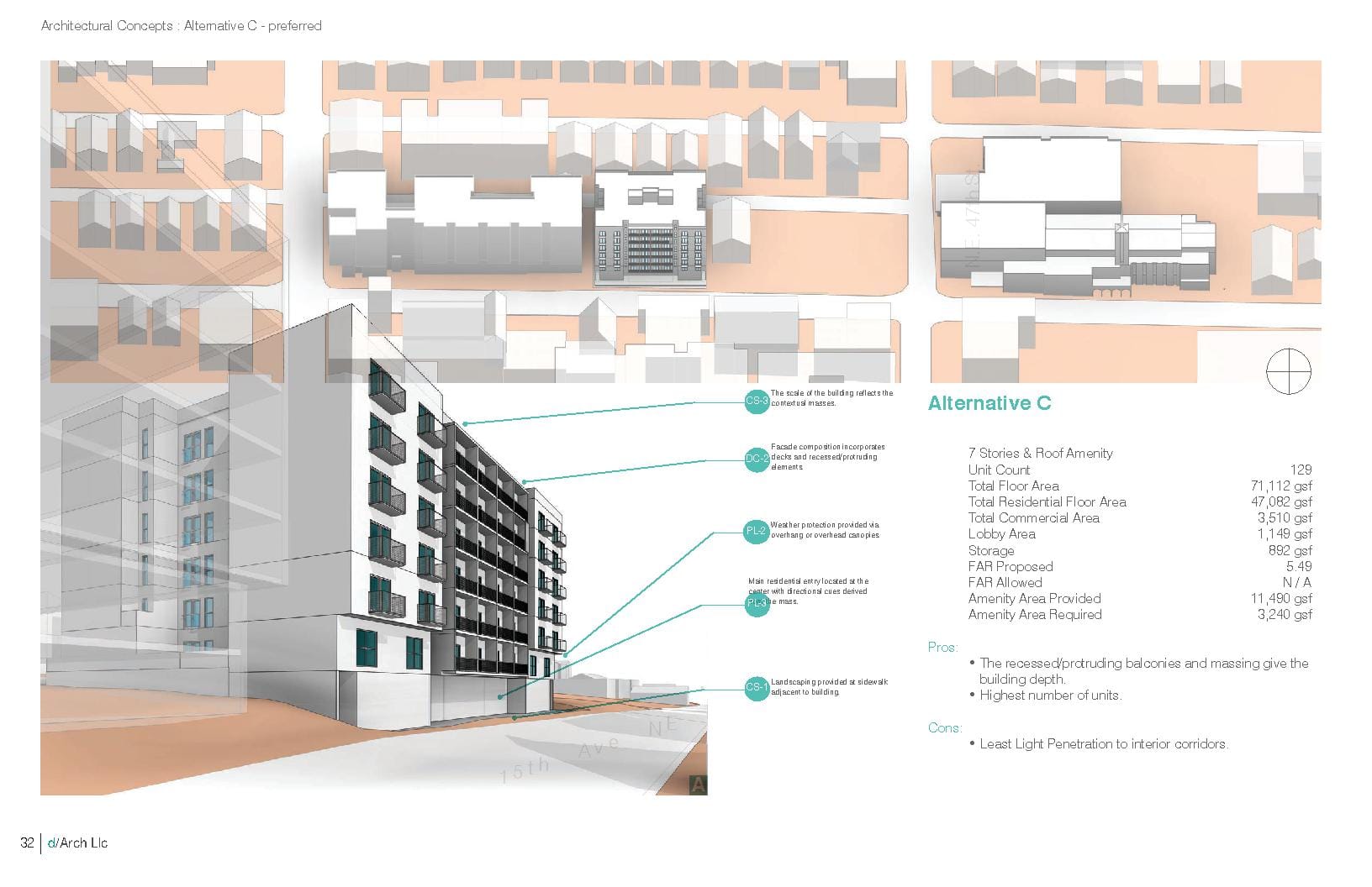This proposal requires a contract rezone from LR3 to NC2-65 which would trigger the MHA-R requirement. That means the project would provide at least twice as many units guaranteed affordable for 75 years than currently exist on the site (and likely not affordable given the location). The developer could either pay the in-lieu fee or provide on-site affordability. If the rezone is determined to be of the M1 variety, then 9 percent of units would be below 60 percent of area median income or a $20 per square foot fee would be paid. That’s would be more than a million dollars based on Alternative C’s total square footage minus the commercial floor area which falls below the 4,000 square foot allowance for street-level retail. (For more on MHA details and tweaks read this.)