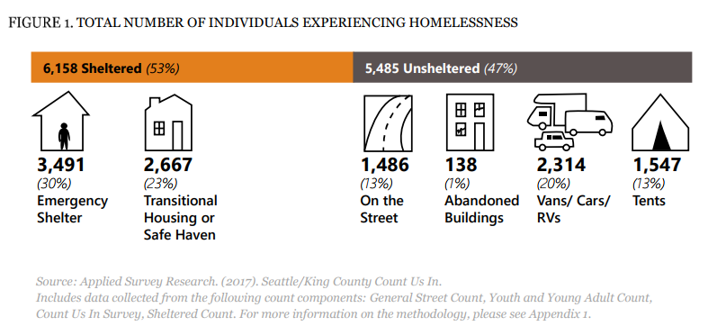 Seattle is a rapidly changing place with a population of 704,352 by last estimate. We know now that population includes an estimated 3,857 unsheltered homeless people and another 4,665 sheltered homeless. Together that’s about 1.2% of the population. One out of every 183 Seattleites is unsheltered on a given night. Mayor Murray declared homelessness a crisis in Novemeber 2015. It’s still a crisis, and we’re still looking for an effective way to alleviate it as soon as possible.