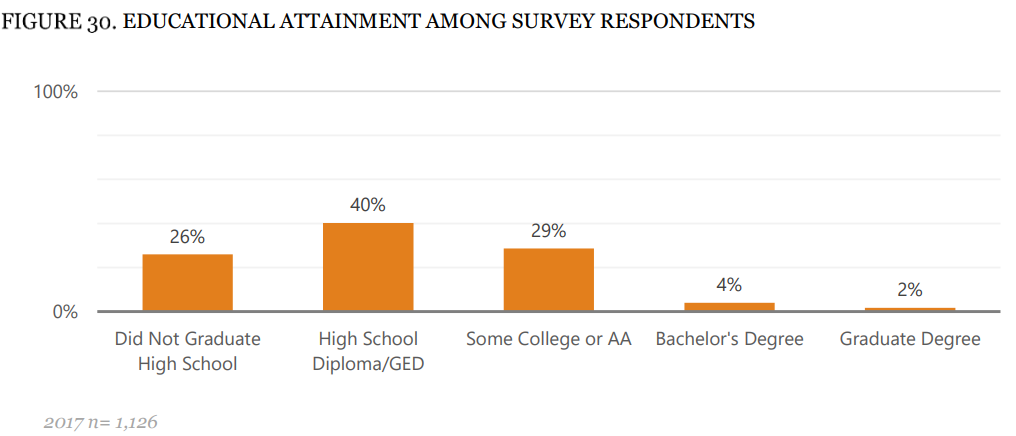 Another way to think about homelessness is a failure of other systems. For example, 19% of survey respondents reported a history of foster care, which is much higher than the general population. 26% did not complete high school. Domestic violence also appeared widespread: “Forty percent (40%) of survey respondents reported experiencing physical, emotional, or sexual abuse over their lifetime.” LGBTQ folks are over-represented, particularly among younger homeless people: “Compared to other Count Us In survey respondents, unaccompanied youth and young adults identified as lesbian, gay, bisexual, transgender, or queer at notably higher rates than other survey respondents (28% compared to 14%).” Veterans are also over-represented at 11% of all respondents. If systems like our education system, foster care, and veteran services were more effective then homelessness might be less.