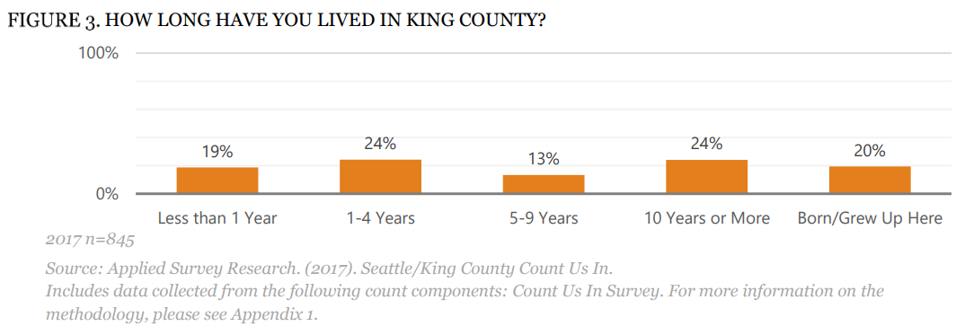 Men made up a much larger portion of the survey than women: “Sixty-five percent (65%) of survey respondents identified as male, 33% identified as female, 2% identified as transgender, and 2% identified as another gender (e.g. gender-queer, gender non-conforming, or non-binary).” King County Department of Community and Human Services Director Adrienne Quinn connected the greater prevalence of male homelessness with the reluctance to build men’s shelters compared to shelters for women or families. Bellevue’s wrangling over an Eastgate homeless shelter is a recent example of opposition to men’s shelters, which likely will delay the project with extra hurdles like studying two additional sites.