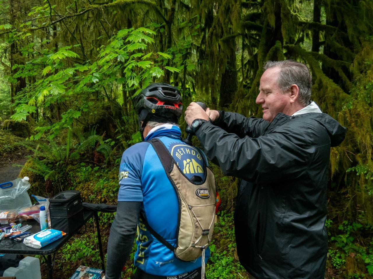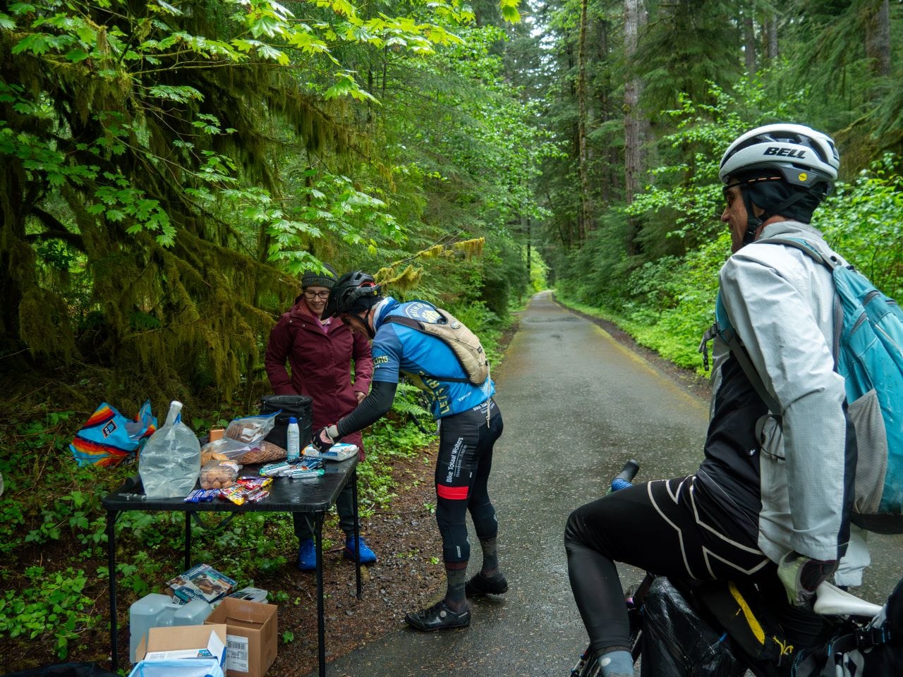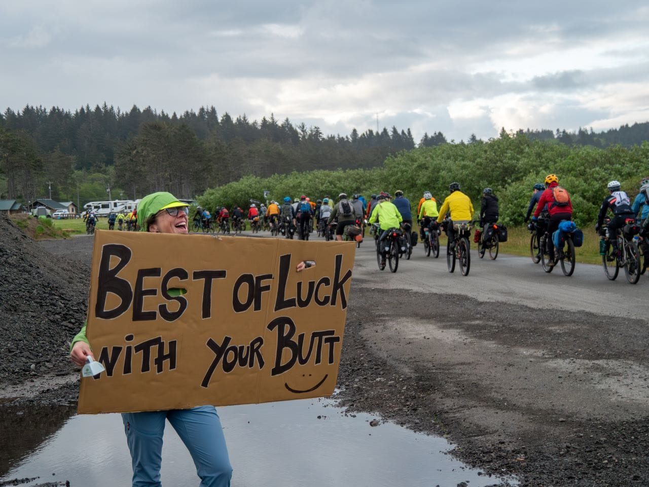 Flapping in the western winds of La Push, a yellow flag bearing a huge smiley face and a printed “XWA” was propped on the back of Brook Muldrow’s RV. He had driven all the way from Oklahoma to serve as a trail angel, someone who supports riders along the route.