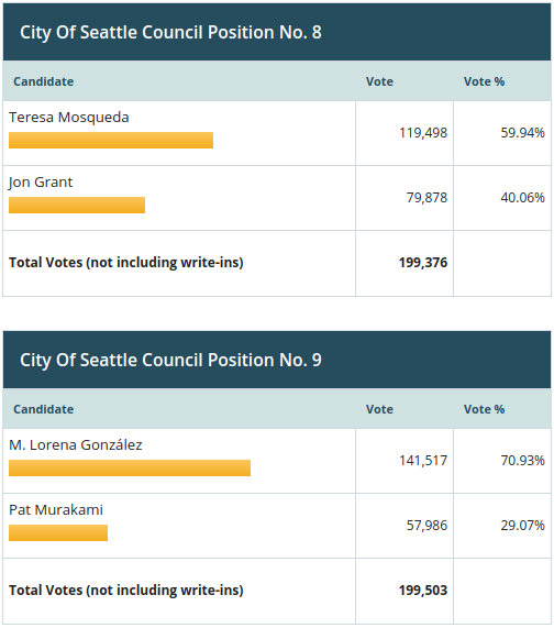 Drop boxes and post offices stopped taking ballots by 8pm last Tuesday but votes are still trickling in–even as outcomes are decided. Cary Moon’s share has been ticking up but she’s far from pulling off the upset, as she sits 43.57% of the vote. It looks like the race will shake out with Jenny Durkan at about 56% and Moon at 44%.