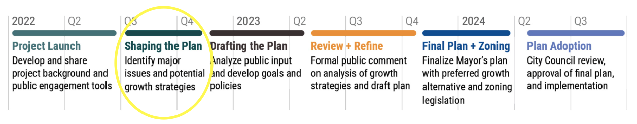 We are currently in the first part of the “Shaping the Plan” phase, meaning the feedback that OPCD receives now will set the tempo for what kinds of actions will be studied, and eventually taken, while the next part will bring an additional round of public feedback that will refine the concepts that will be studied. Thus making a lot of noise right now will have an outsized impact on the entire trajectory of the process. If OPCD does not hear from the public that they want ambitious plans for adding housing to be studied, they won’t do it. And if bolder ideas don’t make it in during this scoping phase, OPCD won’t be able to add them into contention at a later phase because the agency will not have done the analysis needed for the required Environmental Impact Statement.