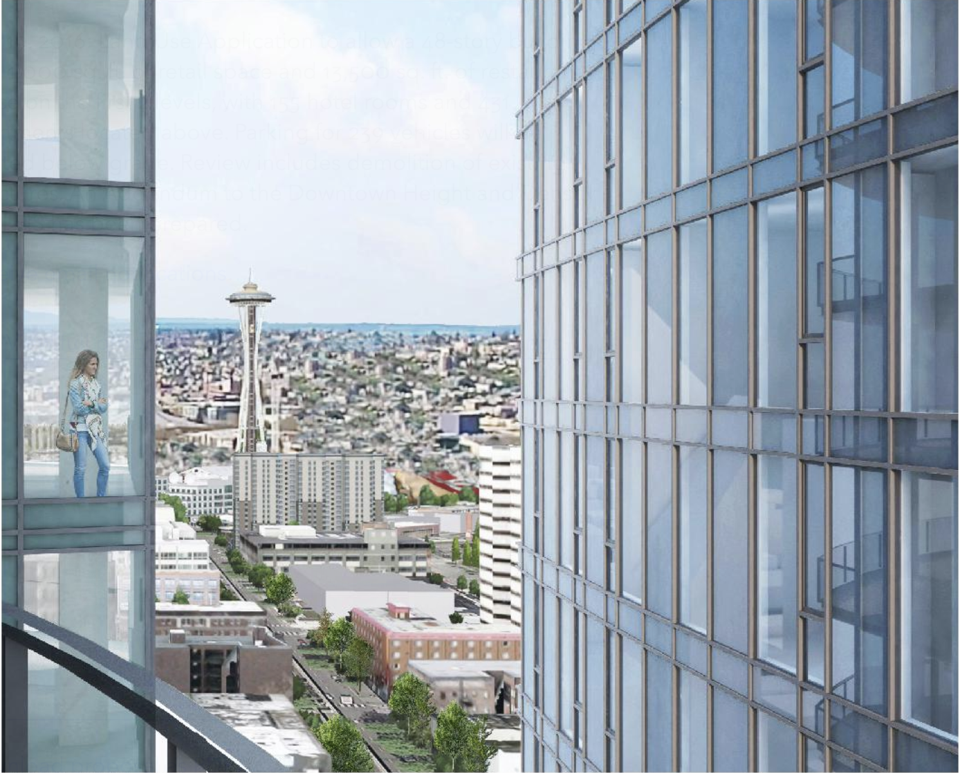 The project is 365 apartments, retail, and 248 parking stalls in two 23-story tall towers in Yesler Terrace overlooking I-5. It is notable for several reasons: its the first highrise development in the Yesler Terrace redevelopment, which while zoned for highrises has thus far produced only midrise buildings; it’s designed by Bohlin Cywinski Jackson, a nationwide firm best know for designing Bill Gate’s Medina estate and a lot of Apple stores; and it’s a pretty interesting design, better than most even. With its delicate stilts and curvy facade it strives to be more than the typical extrusion highrises being built in Seattle.