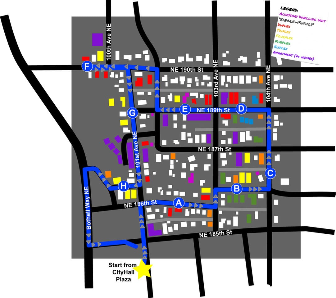 As part of my continuing education, I signed up for Bo-POP’s (Bothellites for People Oriented Places) September “Forbidden Houses of Bothell” walking tour. I was joined by my colleague, Jennie, from Liveable Kirkland, and my husband, Ken. The tour explored Lower Maywood Hill, Bothell’s oldest neighborhood, which showcases house-scale, multi-unit residential options built before 1951, when Bothell’s City Council imposed strict regulations on development. The multi-unit homes in Lower Maywood Hill would now be “forbidden” under current restrictive codes.