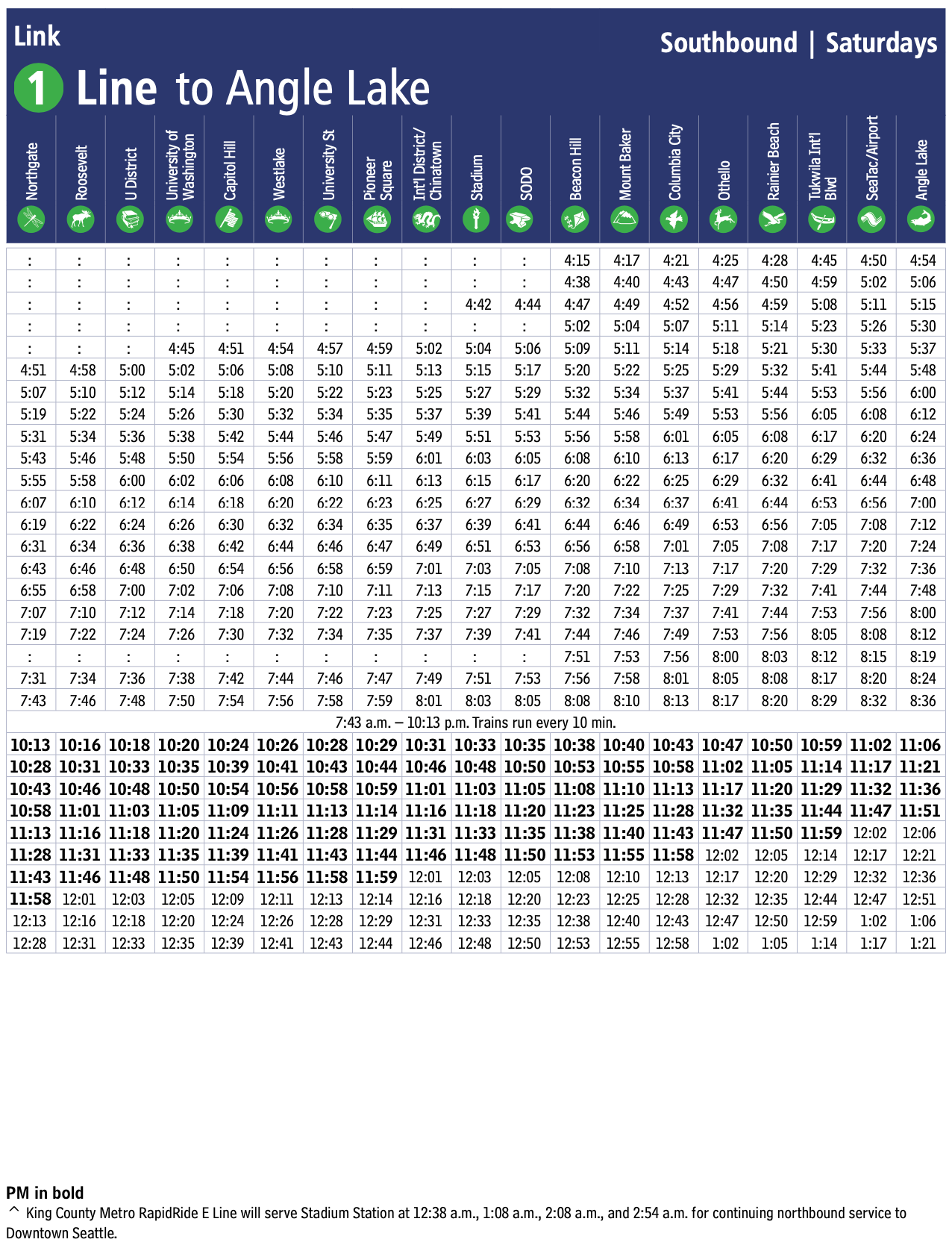 As for the latest full trips, the service pattern is northbound at 11:45pm from Angle Lake and southbound at 12:28am from Northgate on weekday and Saturday nights and northbound at 11:15pm from Angle Lake and southbound at 11:28pm from Northgate on Sunday nights. Later trips still depart northbound from Angle Lake but terminate at Stadium, some with connecting bus service. A full schedule of service is now available.