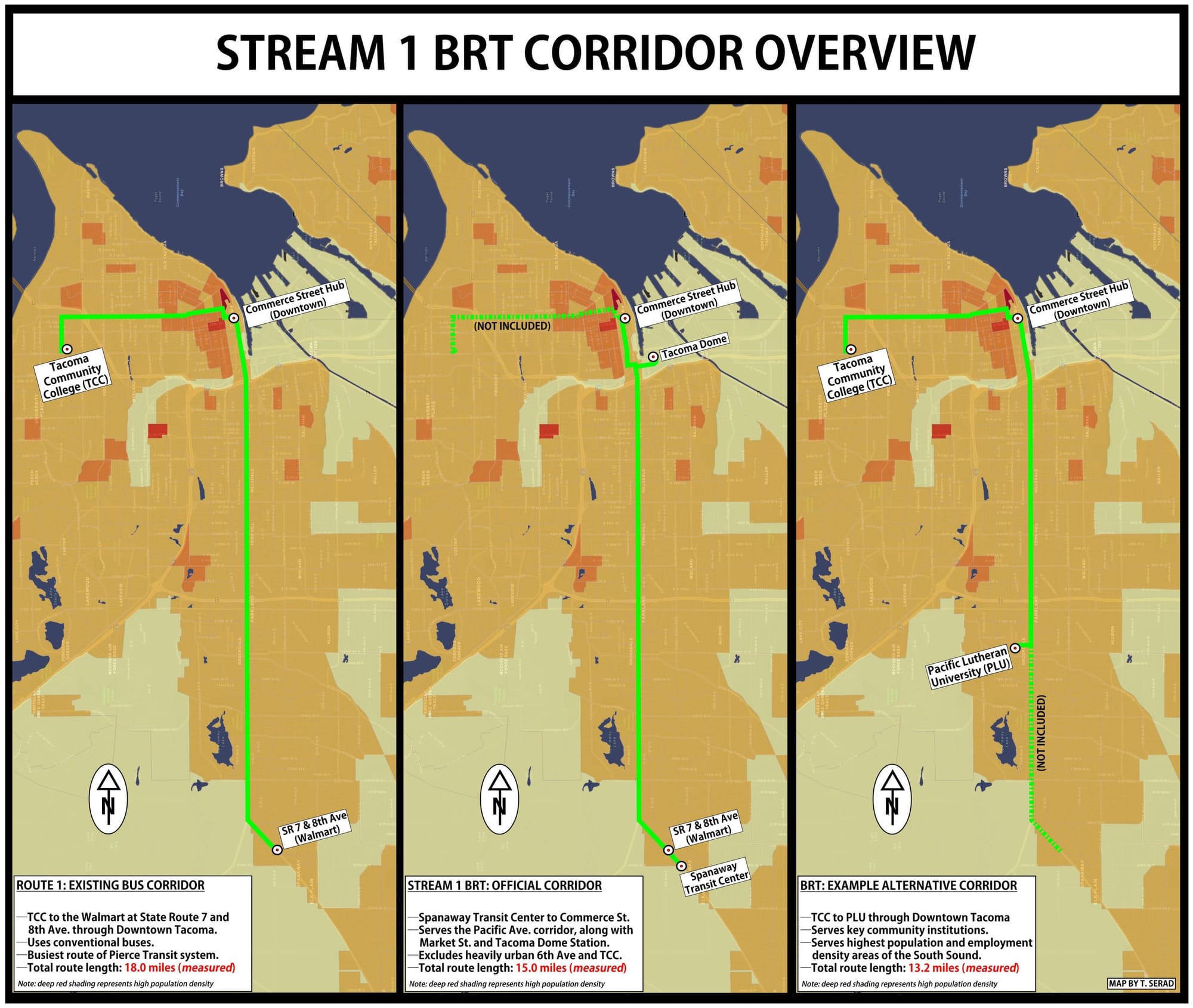 Such an evolution would construct for the South Sound a rapid transit backbone that would enliven Tacoma. A TCC to PLU Stream 1 line would be bookended by prominent educational institutions and tie together the downtown core, Hilltop medical jobs, and the densest neighborhoods in the county. The substantive portions of the original Stream 1 project, in terms of infrastructure investment, would largely be preserved for the evolved corridor. The overall length would also be reduced by 1.8 route miles, even while dramatically expanding coverage.