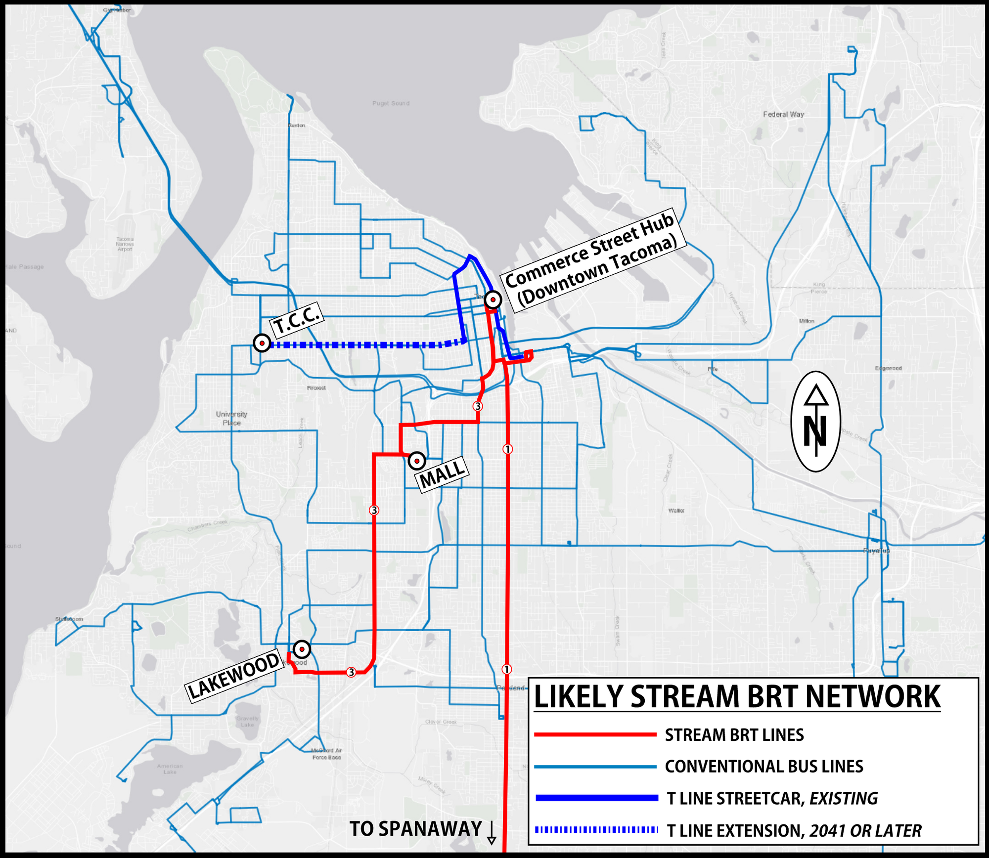 Achieving a complete build-out of Stream 1 from TCC to PLU would re-establish a critical, high-capacity transit artery within Tacoma through which all future BRT routes connect or intersect. All major neighborhood zones in Tacoma would be served by it, bridging the city’s notorious east-west divide. It eliminates transfers, irons out the kinks from the forthcoming line deviations, and becomes the principal route within a larger Stream BRT network. The evolution is essential if Tacoma to develop a BRT network that is more sophisticated than a hub-and-spoke system, offering better service and connections for people traveling across the city.