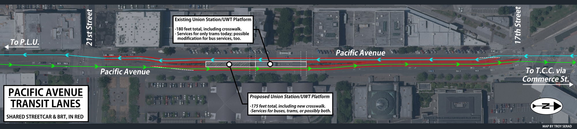 It is for these reasons that the current project should be viewed only as a temporary phase within a larger corridor build-out. This piece proposes that long-range plans be developed that would allow Stream 1 to evolve into an alignment that stretches 13.2-miles, from Tacoma Community College (TCC) to Pacific Lutheran University (PLU), an intuitive and intelligent corridor. This proposal should be the focus of the SSES and expansion plans.